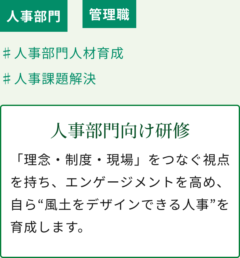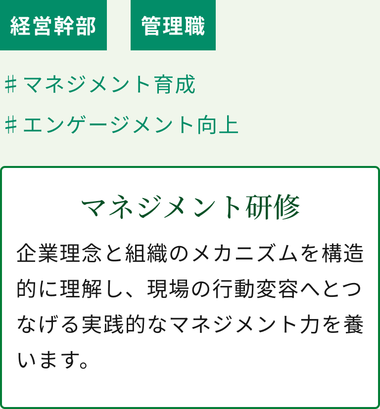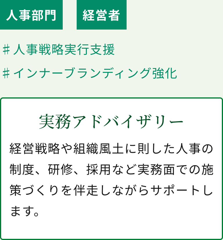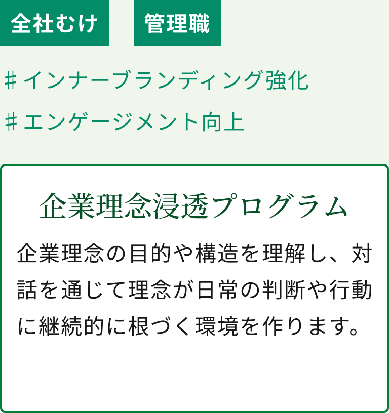 理念を起点に、現場が主体となって動く組織風土を醸成し、社員一人ひとりが活気に満ちた職場環境を貴社と共に目指します。